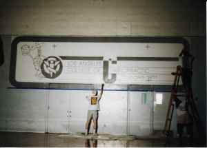 Some behind the scenes information on the mural painting: While the mural was hand painted, I fist drew it on a regular sheet of paper and merged it with the LACC logo and letterhead. We then enlarged the image by projecting it on the gymnasium wall and outlined it with pencil. Once the penciled-image was on the wall, we broke out the paints. For more on the mural click here.