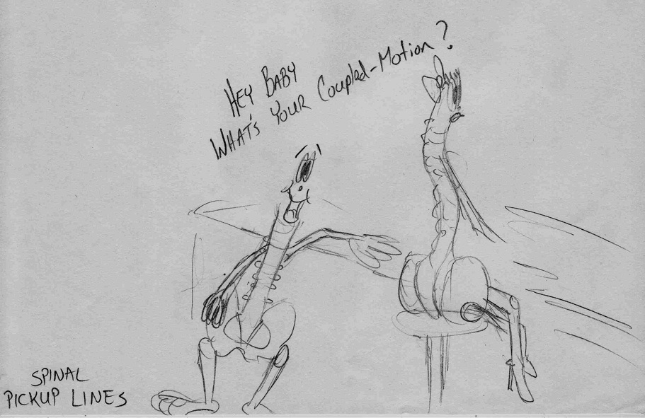 Here is the original “Spinal Pickup Lines” sketch. In the final version, the point of view shifted. You can view that version by clicking here.