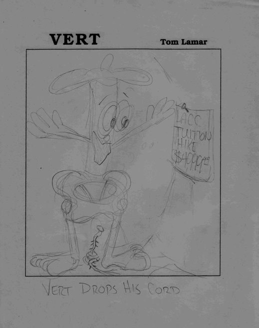 Here’s an editiorial cartoon idea that never made it to the final stages. Here we see that Vert has “dropped his spinal cord” as he reads the posting of the LACC Tuition Hike. What does “dropping one’s cord” mean? — I’m not sure exactly. It seemed funny at the time, though. If I had to guess, I would say that it probably is the equivalent of “crapping in one’s pants.” 🙂