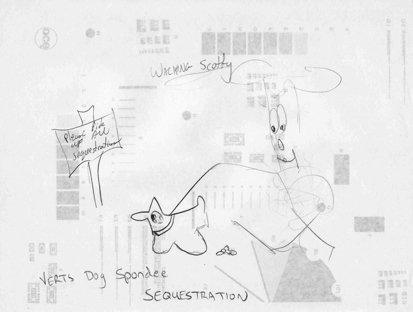Here’s a cartoon idea that never had a chance to make it to the top of the pile: Vert taking his dog, Scotty, for a walk. The joke is based off of a spinal condition known as spondylolisthesis [see panel 25 — “Some words of ‘Encouragement’ from Verta” for another cartoon that uses this theme]. One of the main ways that this condition is diagnosed is with an x-ray — specifically a lumbar oblique x-ray. It is with this “diagonal” view that radiologists have coined the anatomical “Scotty Dog.” So, in other words, if you look at a lumbar spine oblique film you can see that the vertebrae are sort of in the shape of something that might resemble Scottish Terriers. When a Scotty Dog has a “collar” it signifies a “break” in the pars interarticularis — giving rise to the spondylolistheis diagnosis. The sign on the lawn reads “Please Pick Up All Sequestrations.” Sequestrations are bits of disc material that will sometimes break off from the main part of the disc in advanced cased of disc herniations. So in our cartoon, sequestrations = dog poop. And if Vert’s not careful, he’s about to step in one.
